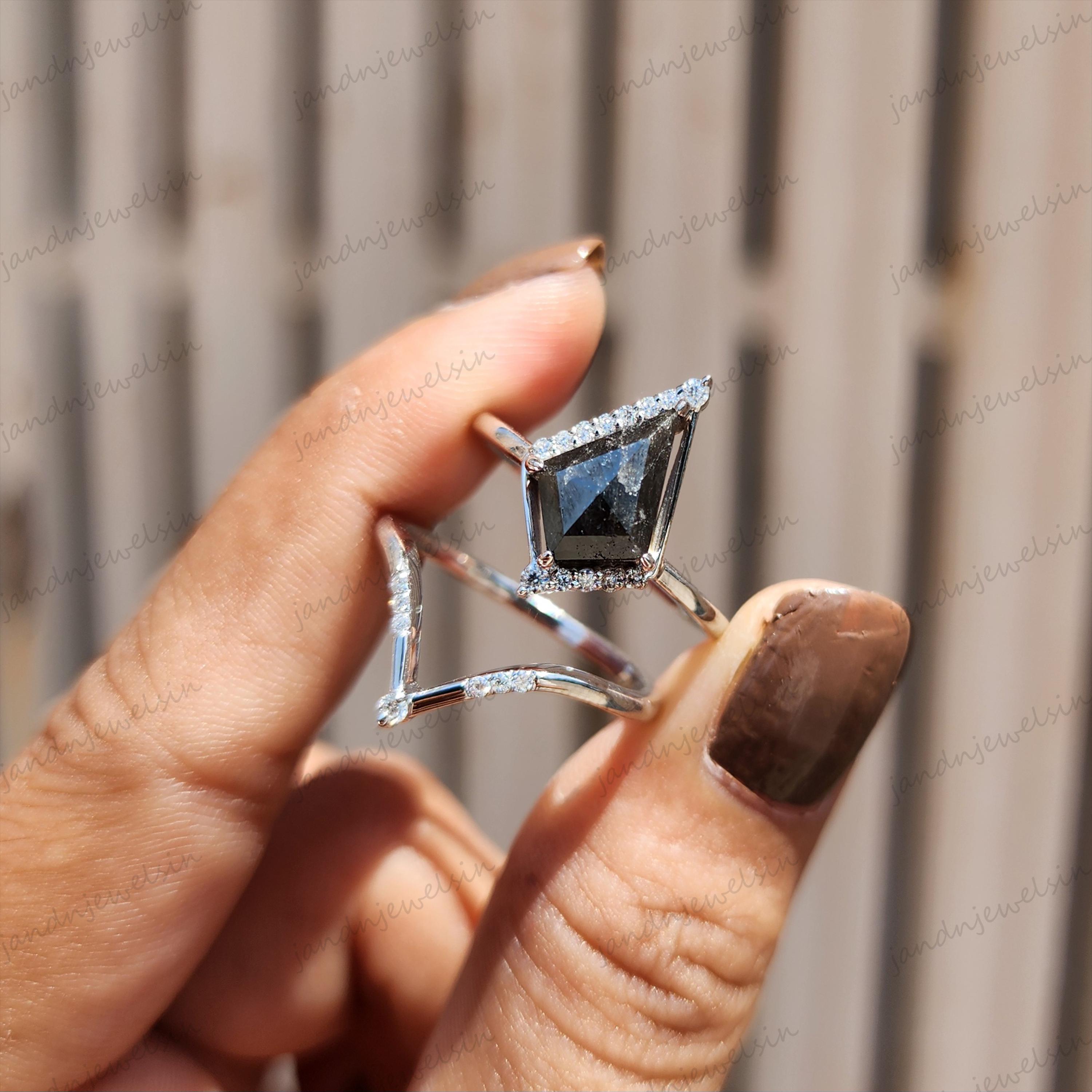 Kite Cut Salt and Pepper Diamond Bridal Ring Set Art Deco Engagement Ring Vintage Wedding Ring Alternative Bridal Gift for Her, black kite cut ring, engagement ring set, 14k gold ring, gold ring, diamond ring, wedding band set, art deco ring set, solid gold ring set, proposal ring set, vintage style ring, anniversary ring set, gift for her, gift for mom