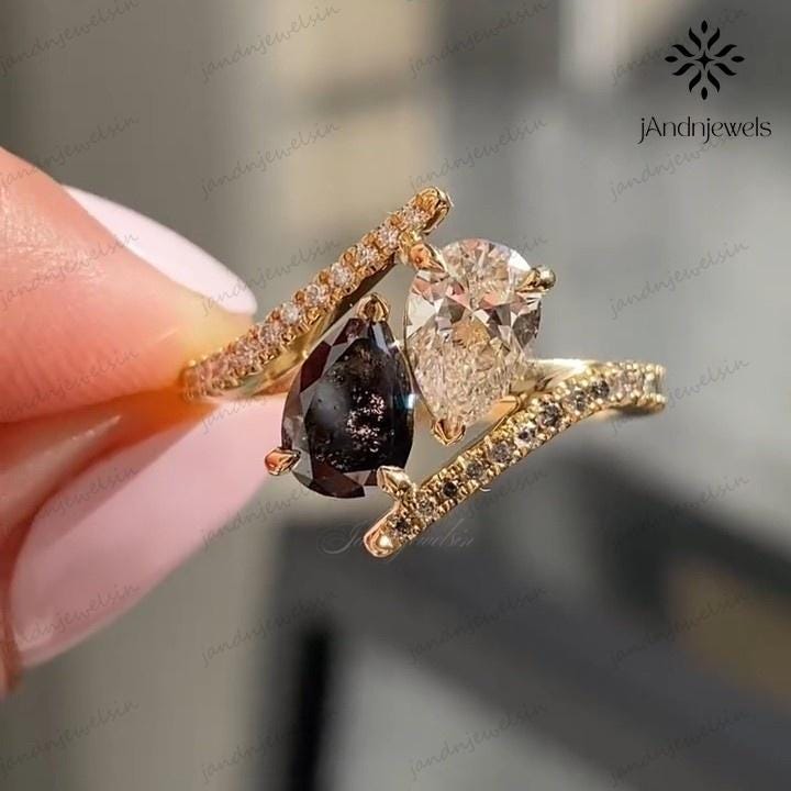 2CT Pear Lab Grown Diamond Ring Salt and Pepper Black Diamond Ring 14K Gold Bypass Engagement Ring Toi et Moi Ring Unique Two Stone Ring, pear cut ring, lab diamond ring, lab grown ring, salt pepper ring, diamond ring, 14k gold ring, bypass ring, engagement ring, toi et moi ring, two stone ring, unique ring, pear diamond, proposal ring