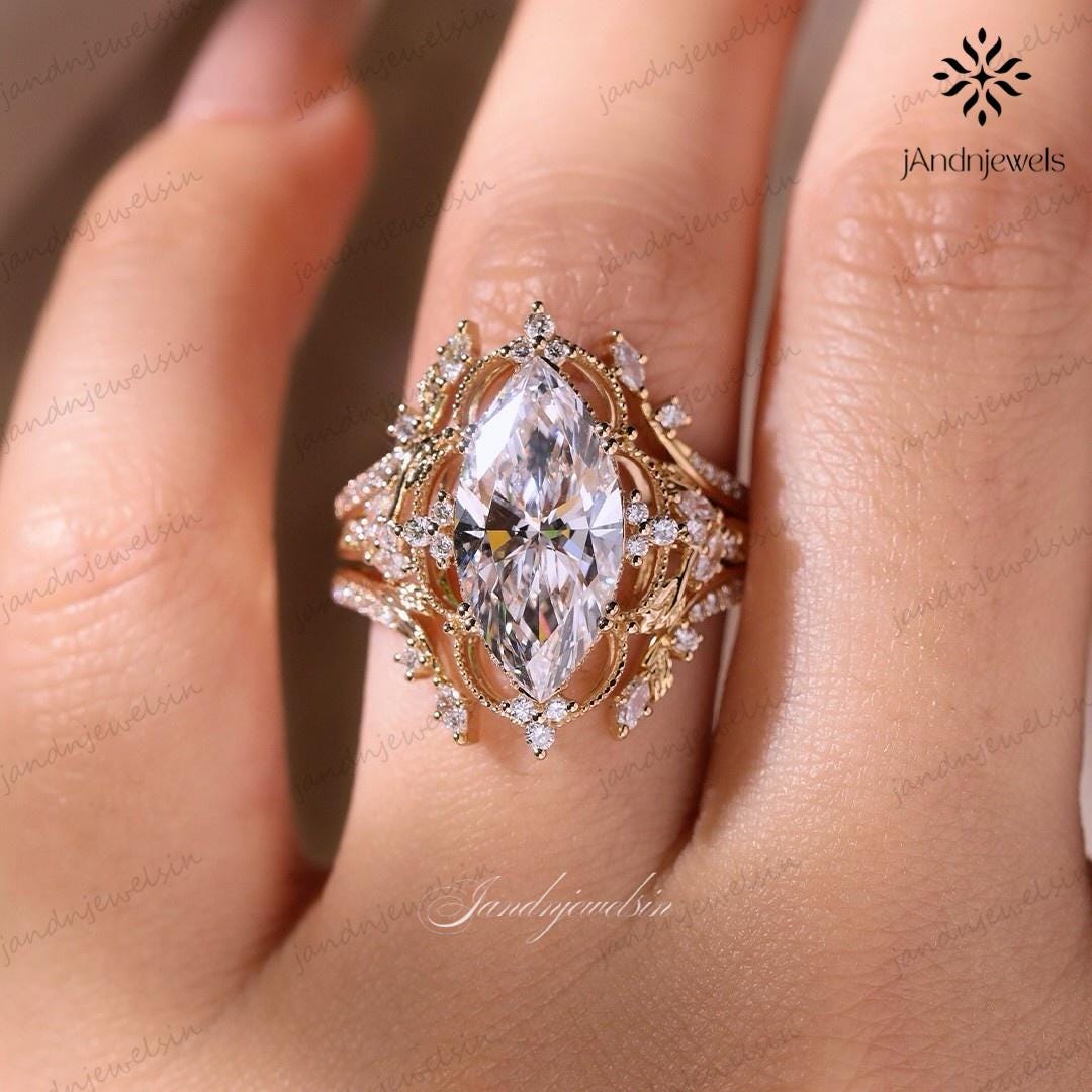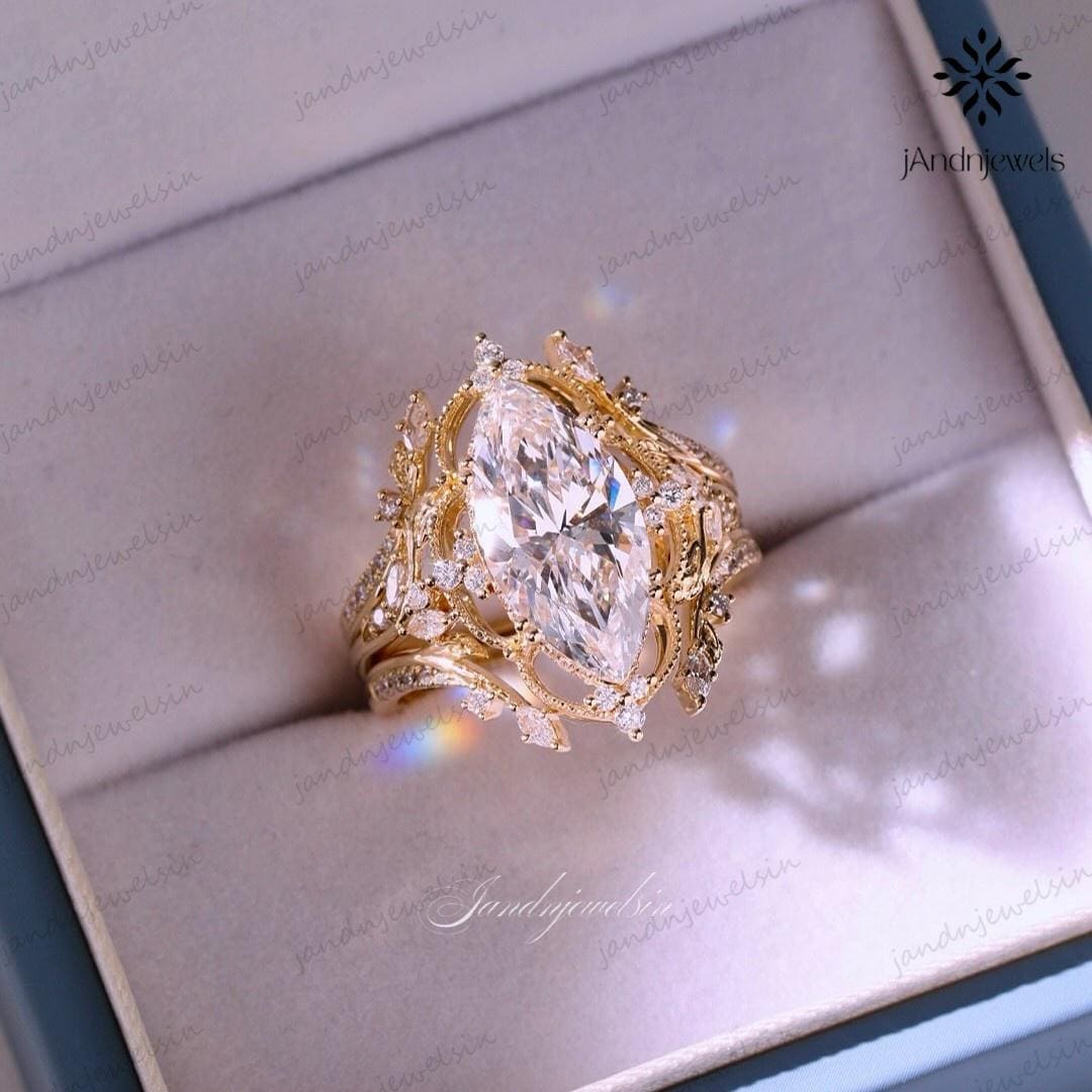 Art Deco Marquise Cut Moissanite Engagement Ring With Enhancer Bands 14K Gold Vintage Floral Halo Wedding Ring Set Anniversary Gift For Her, marquise ring, 4ct moissanite ring, bridal ring set, engagement ring set, wedding ring set, 14K gold ring, vintage ring, art deco ring, enhancer band, diamond ring, lab grown diamond, vintage inspired ring, anniversary ring