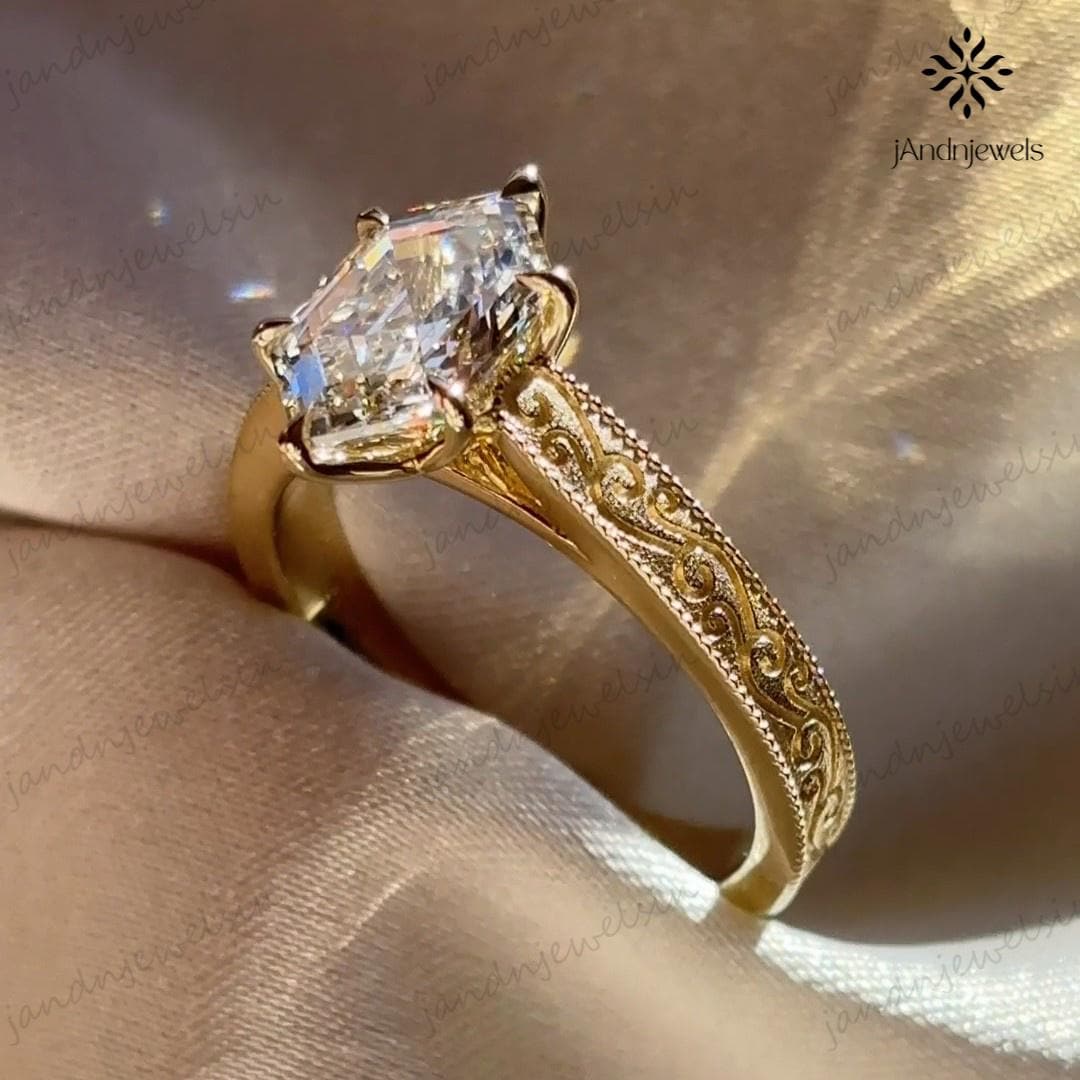Vintage Hexagon Cut Moissanite Engagement Ring 14K Gold Art Deco Milgrain Diamond Ring Unique Wedding Ring Promise Ring for Her
