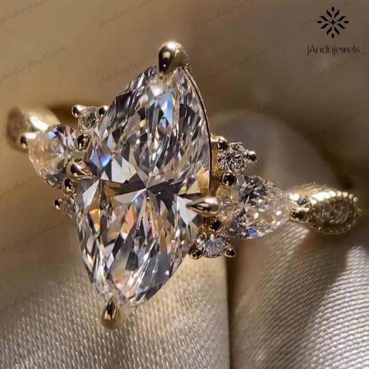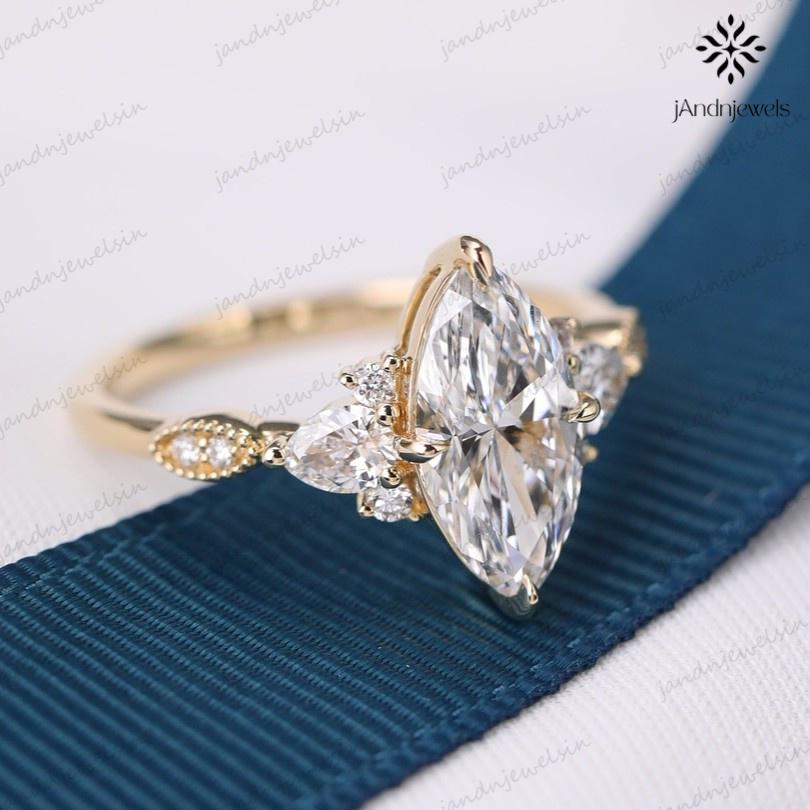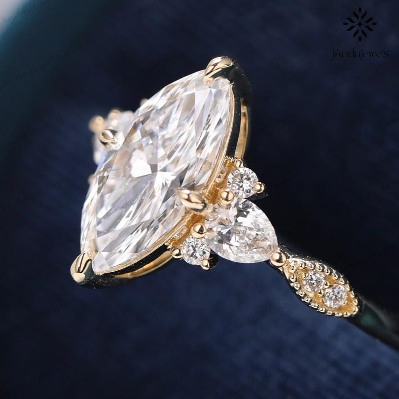 This 2.5CT Marquise Cut Moissanite Engagement Ring features a brilliant marquise center stone complemented by pear and round side stones for a radiant sparkle. Crafted in solid 14K gold with a detailed milgrain band, this ring beautifully combines elegance and timeless charm. Perfect as an engagement, wedding, or anniversary ring, it’s a stunning symbol of love and sophistication designed to shine brilliantly for a lifetime.