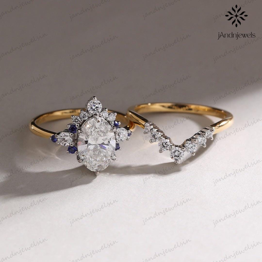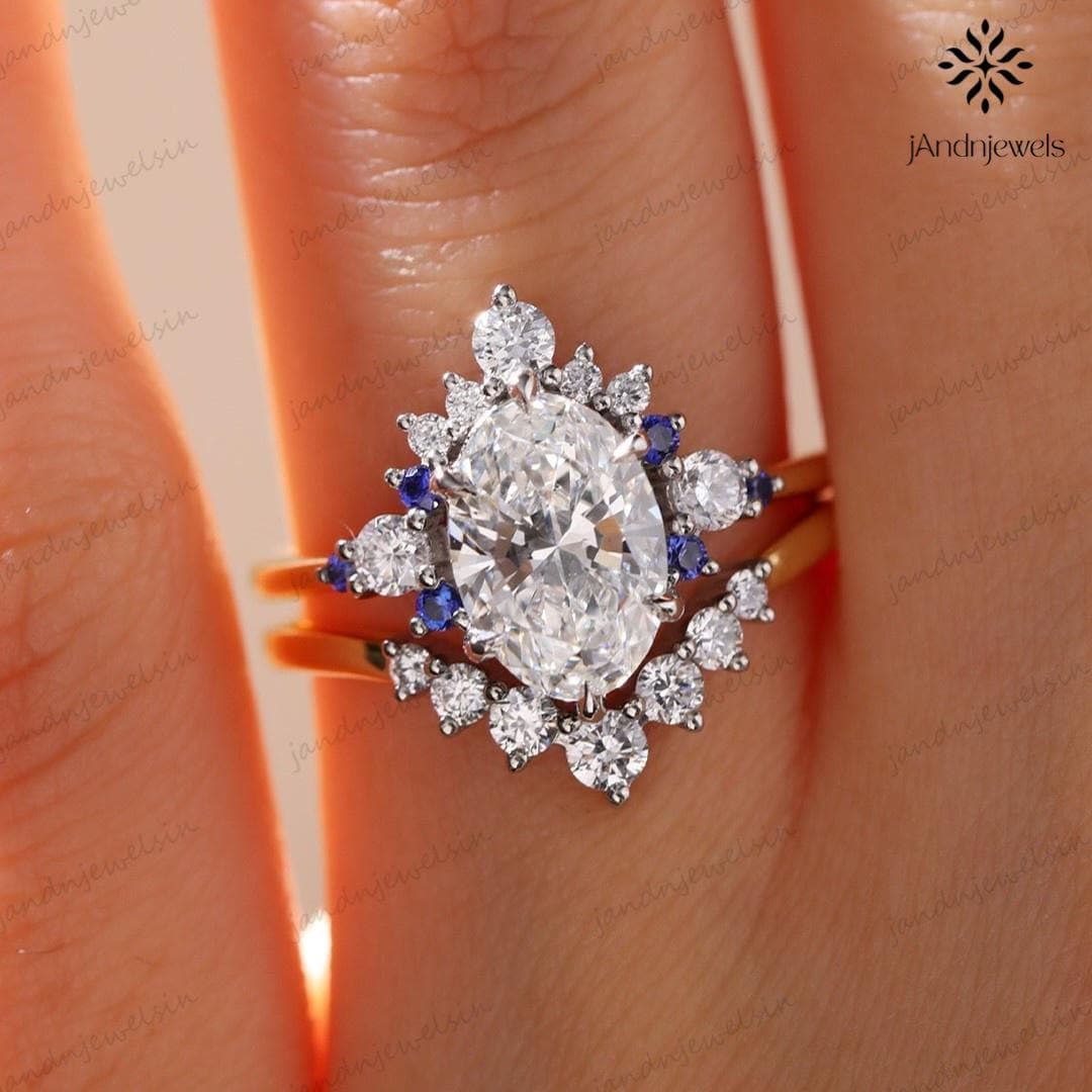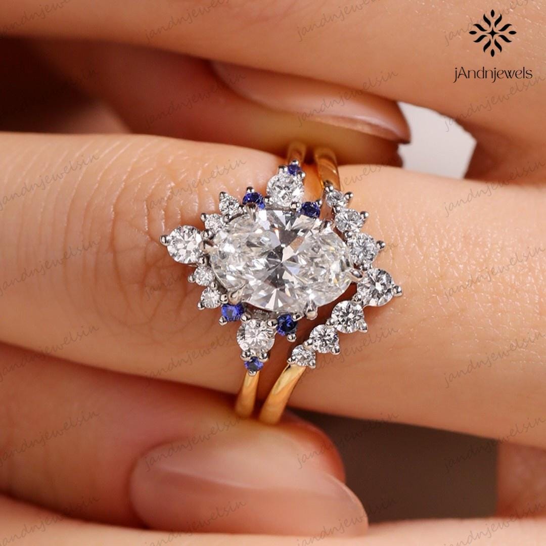 3CT Oval Moissanite Engagement Ring Set Starburst Halo Diamond Ring Set Blue Sapphire Accents Ring 14K Gold Ring Set Vintage Wedding Ring, oval ring, starburst ring, oval cut ring set, oval moissanite, moissanite ring set, wedding ring set, engagement ring set, promise ring set, nature ring, 14K gold ring, gold ring, diamond ring, bridal ring set