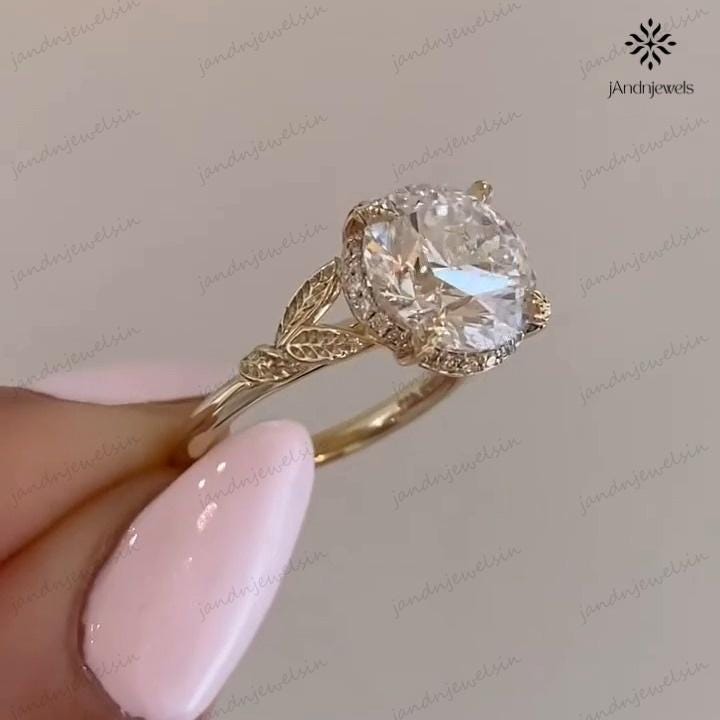 4CT Oval Moissanite Engagement Ring Vintage Engraved Gold Band Classic Solitaire Wedding Ring Unique Prong Ring Anniversary Gifts, round ring, wedding ring, engagement ring, unique ring, solitaire ring, hidden halo ring, diamond ring, cathedral ring, leaf prong ring, 14K gold ring, gold ring, anniversary ring, 925 silver ring