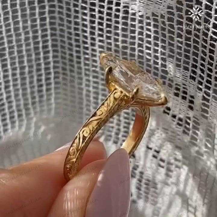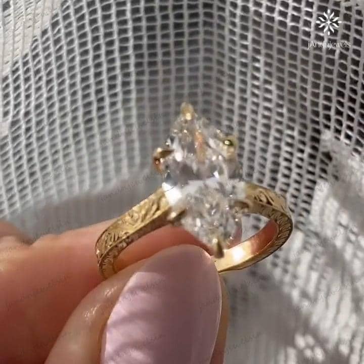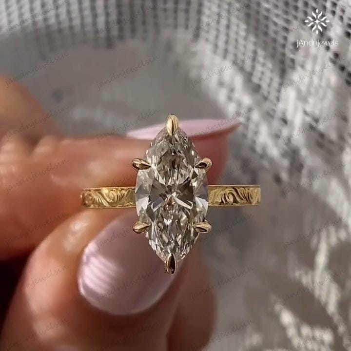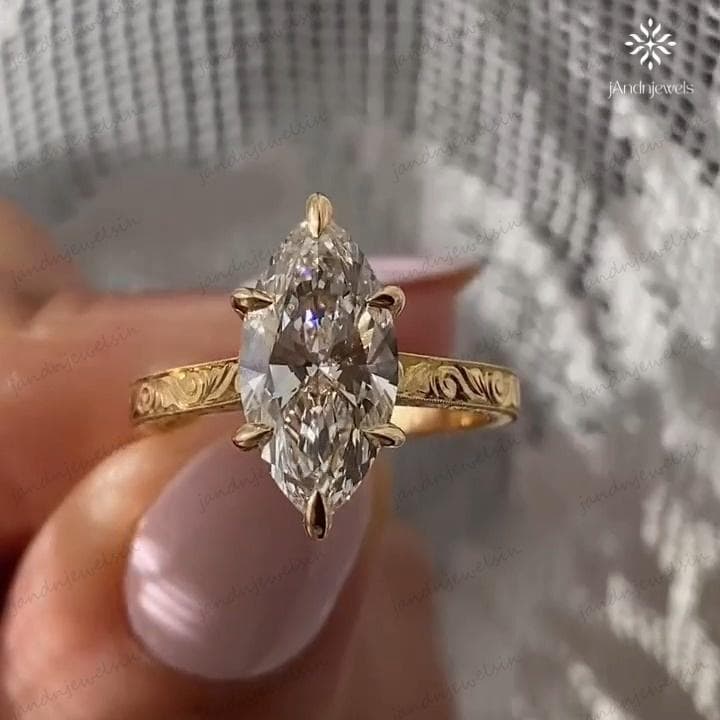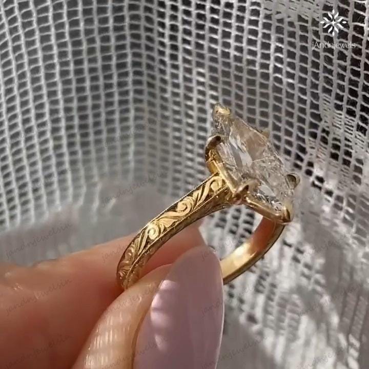 3CT Marquise Cut Moissanite Engagement Ring Vintage Engraved 14K Yellow Gold Six Prong Solitaire Art Deco Bridal Ring for Her, marquise ring, marquise cut ring, moissanite ring, engagement ring, wedding ring, 14K gold ring, diamond ring, vintage ring, engraved ring, artdeco ring, solitaire ring, bridal ring, six prong ring