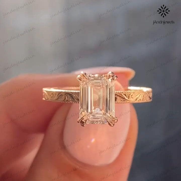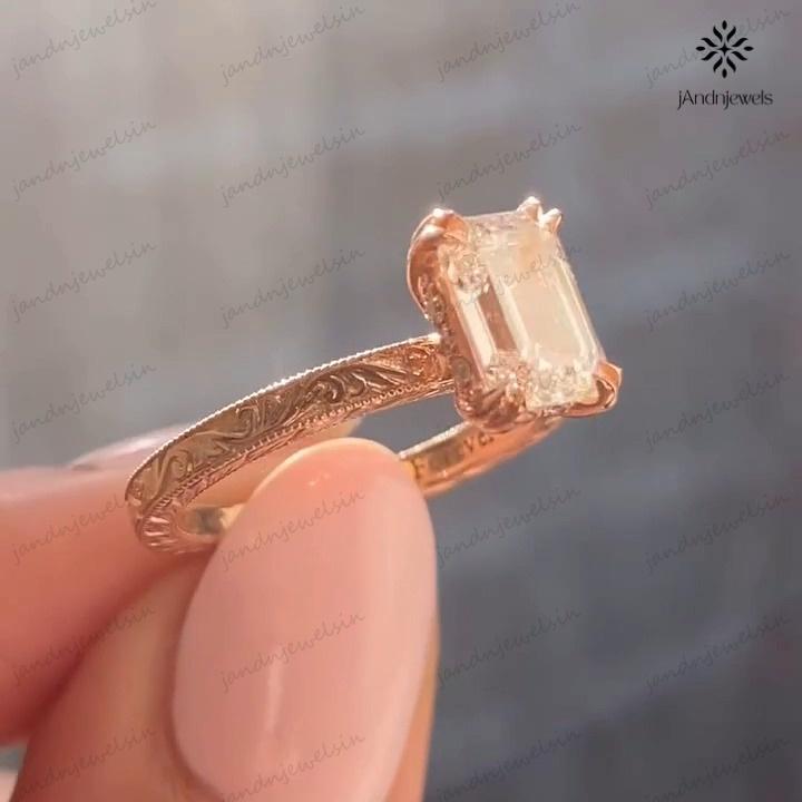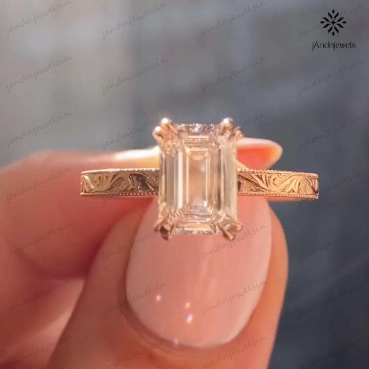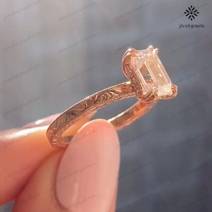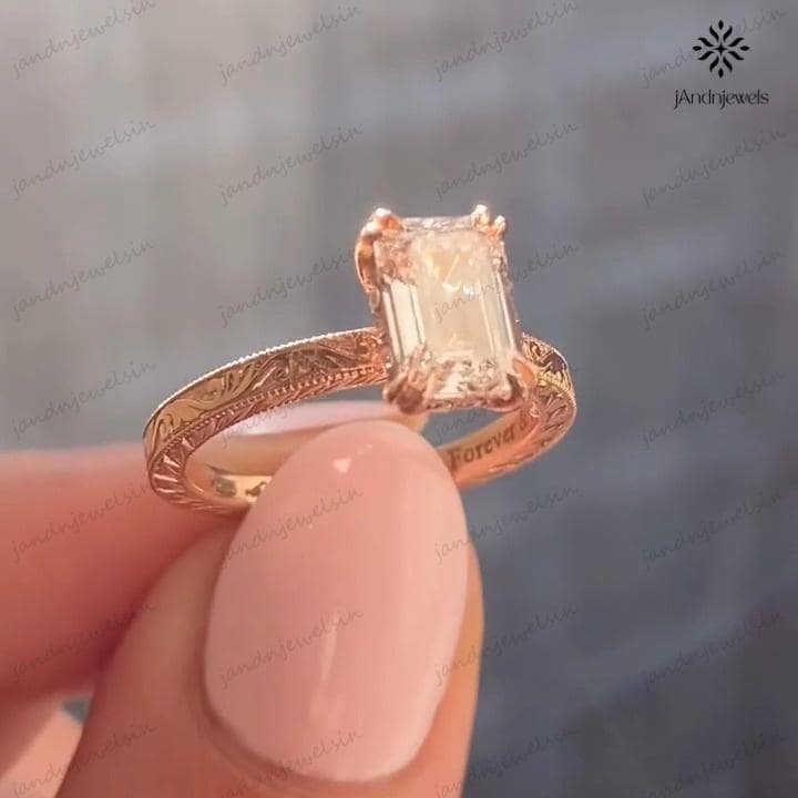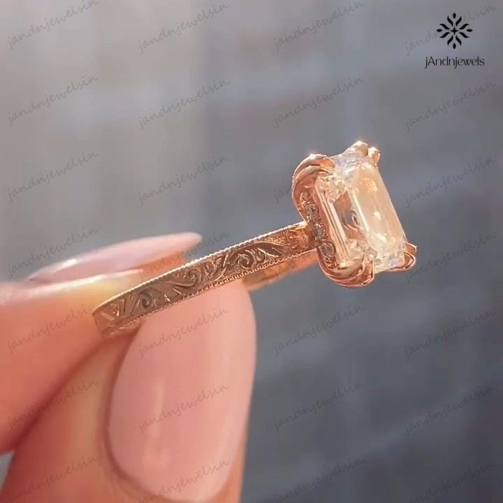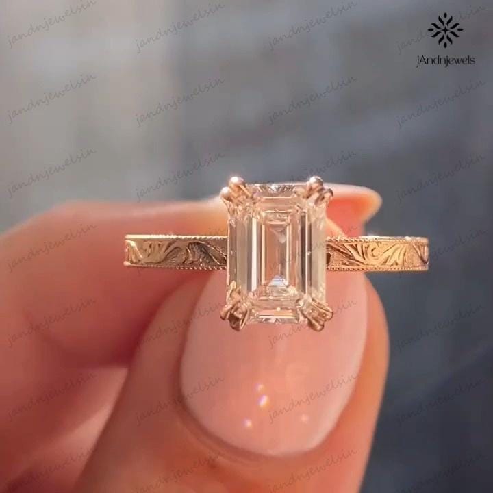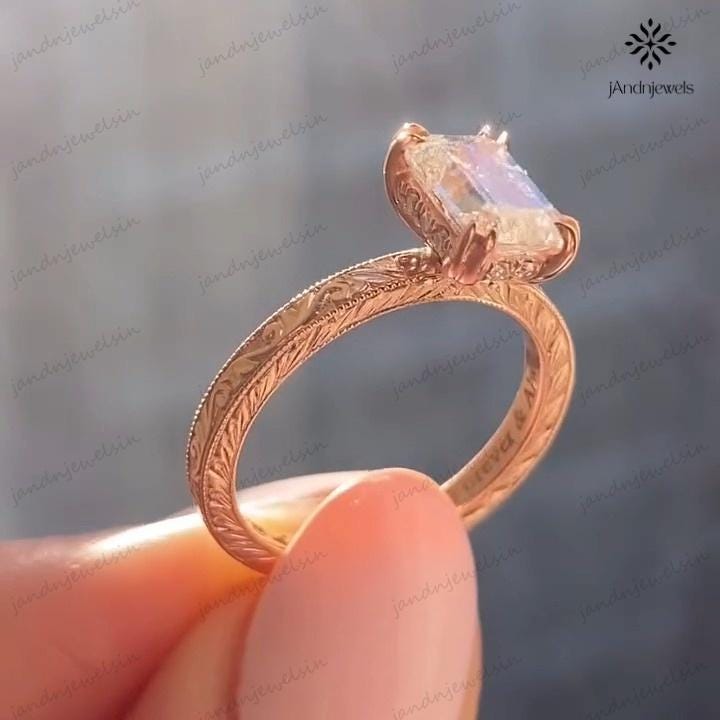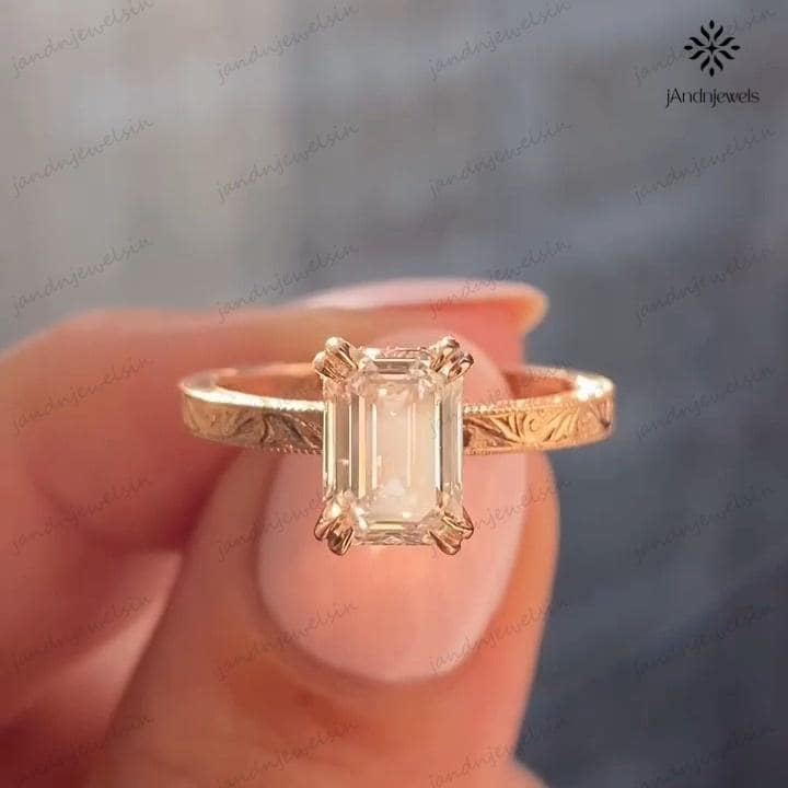 3CT Emerald Cut Moissanite Engagement Ring 14K Gold Vintage Engraved Band Solitaire Ring Wedding Ring Unique Bridal Promise Ring For Him