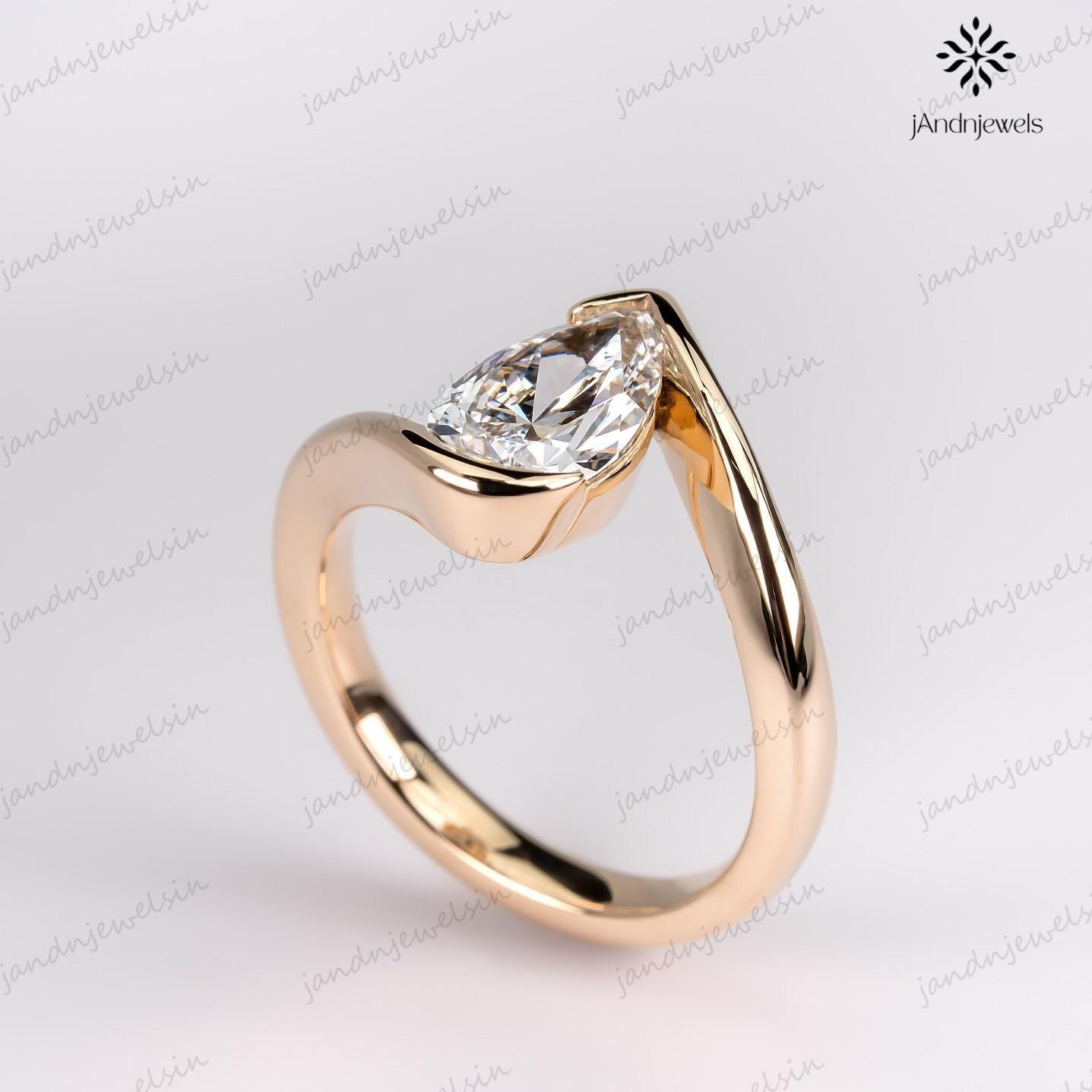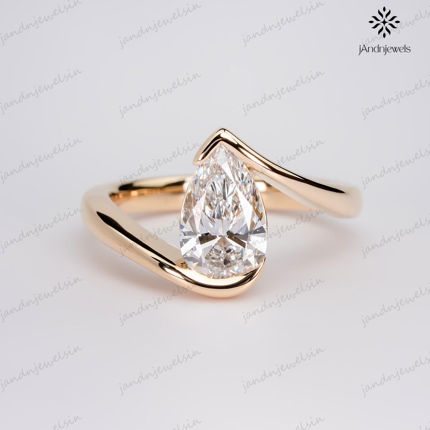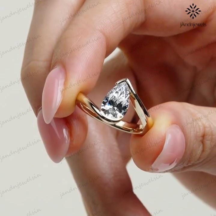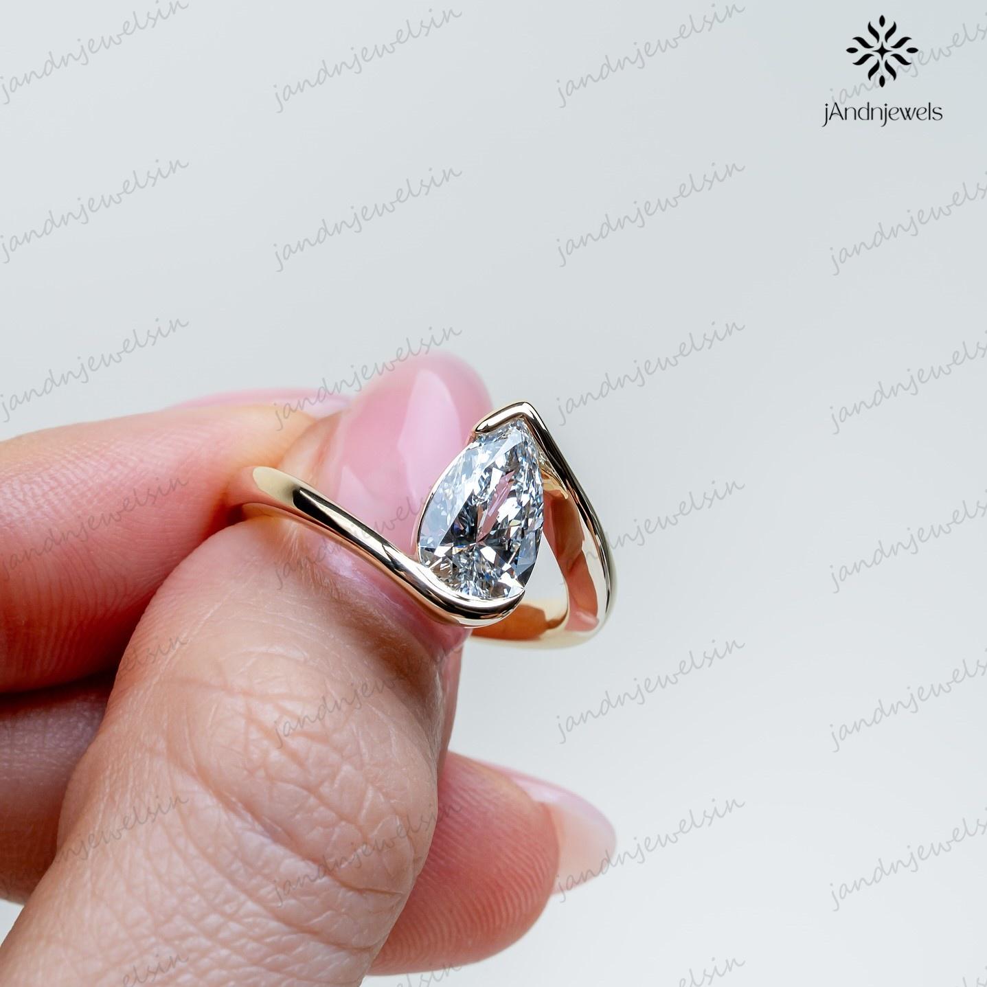 2CT Pear Cut Moissanite Engagement Ring Bezel Set Solitaire Ring 14K Yellow Gold Bypass Bridal Ring Unique Wedding Ring Anniversary Gifts