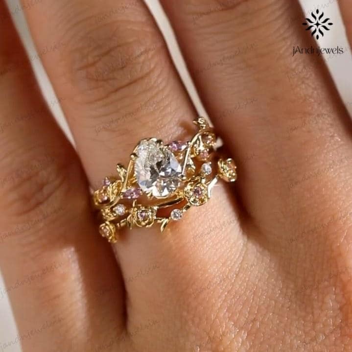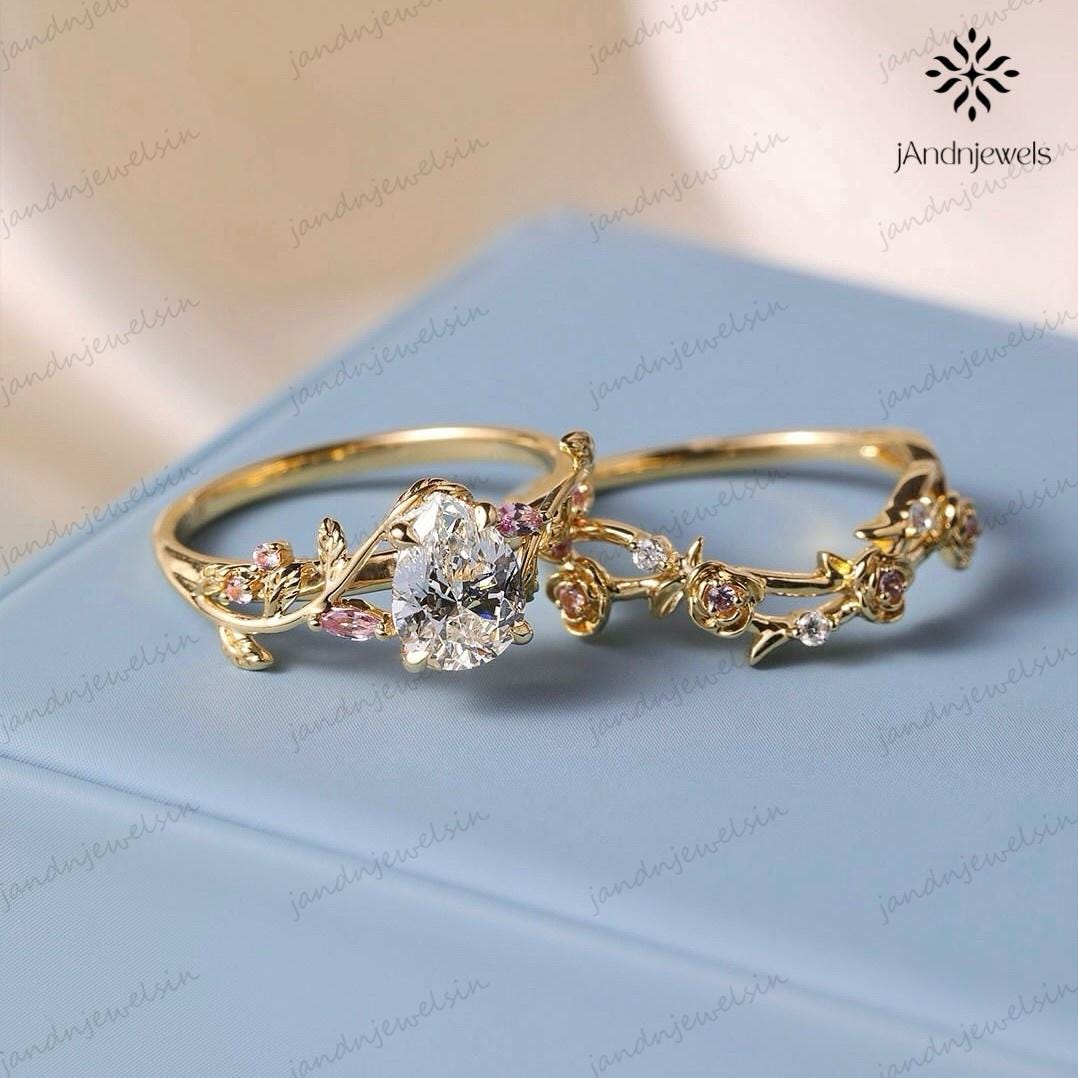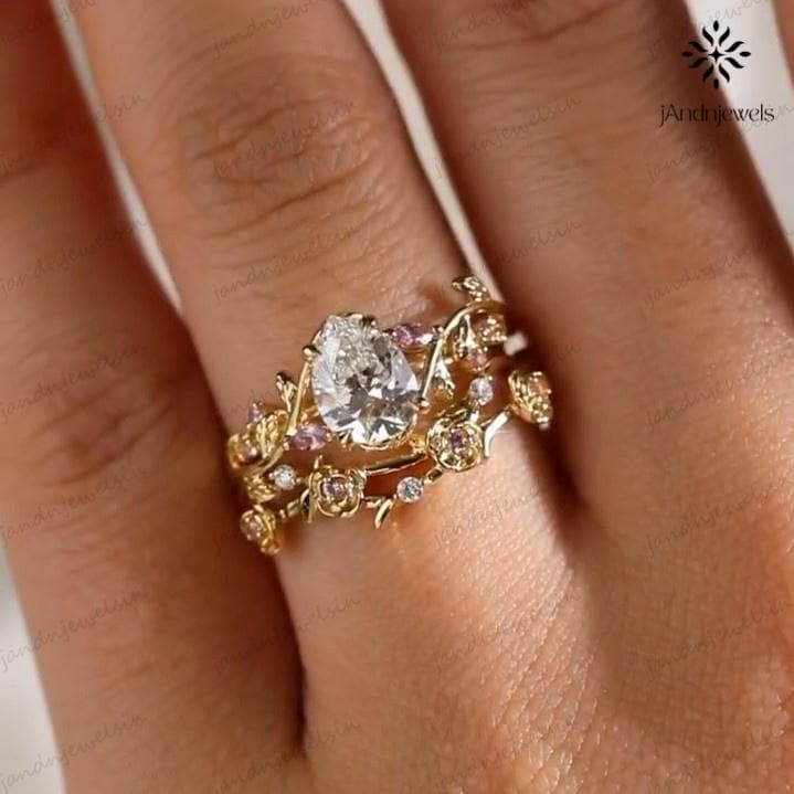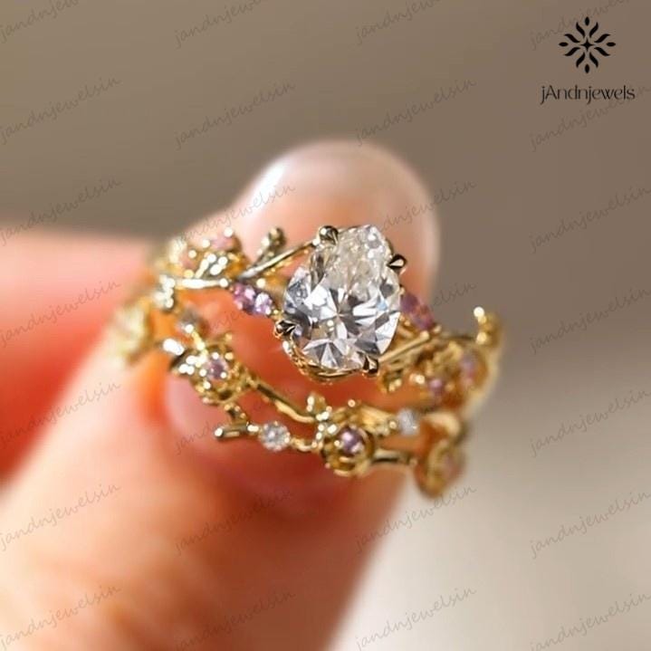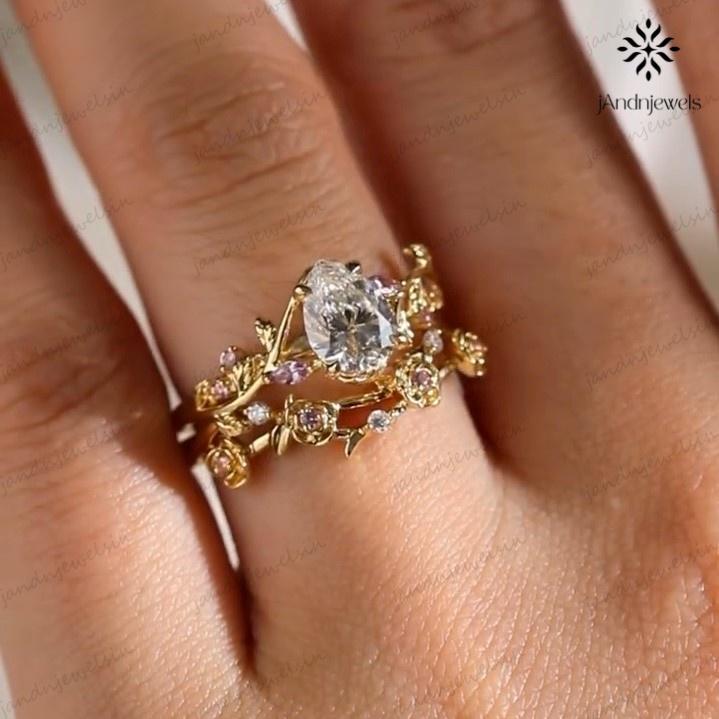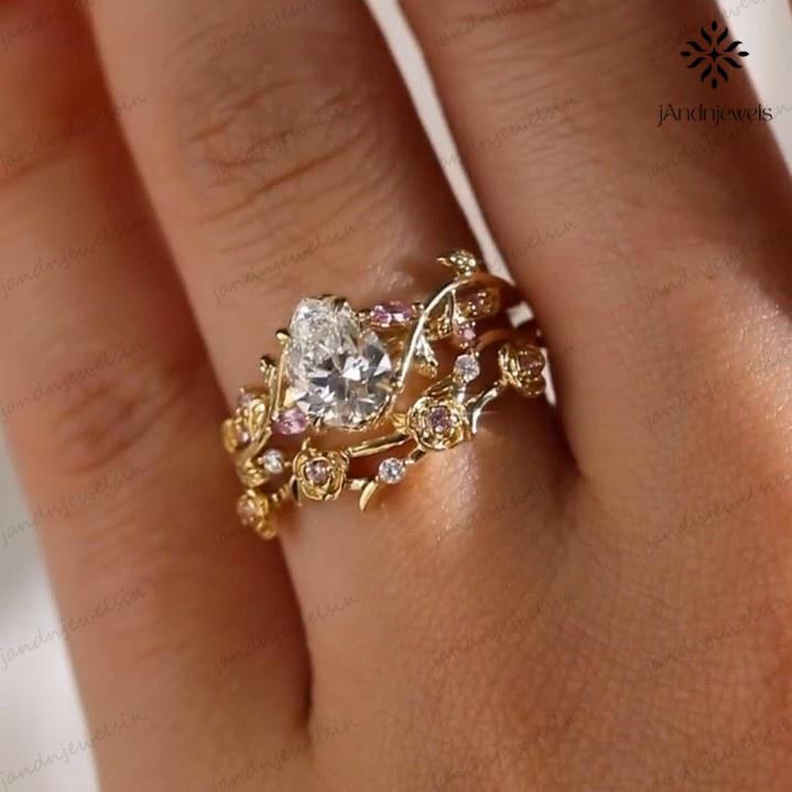 2CT Pear Cut Moissanite Ring Set Floral Leaf Engagement Ring 14K Gold Nature Inspired Wedding Ring for Women Unique Vintage Bridal Ring