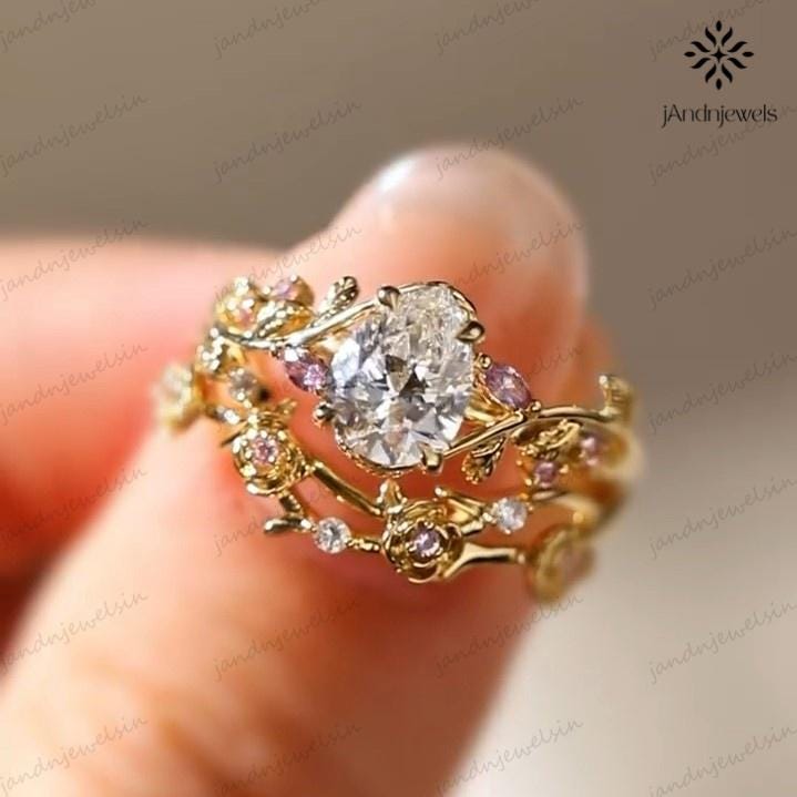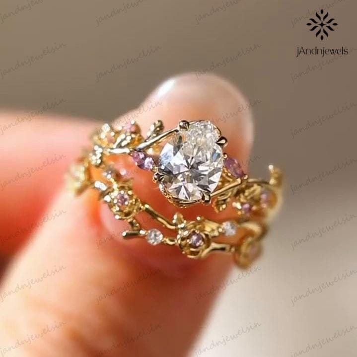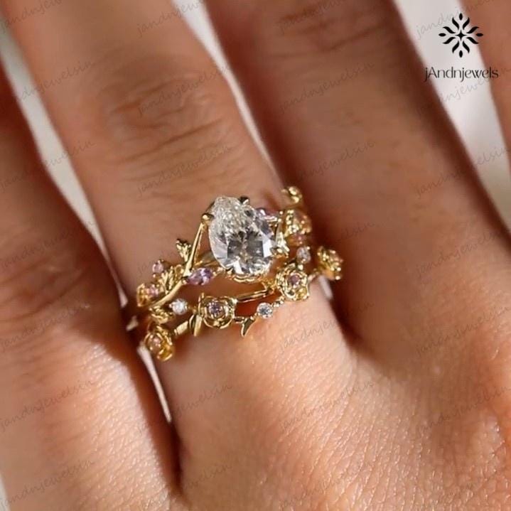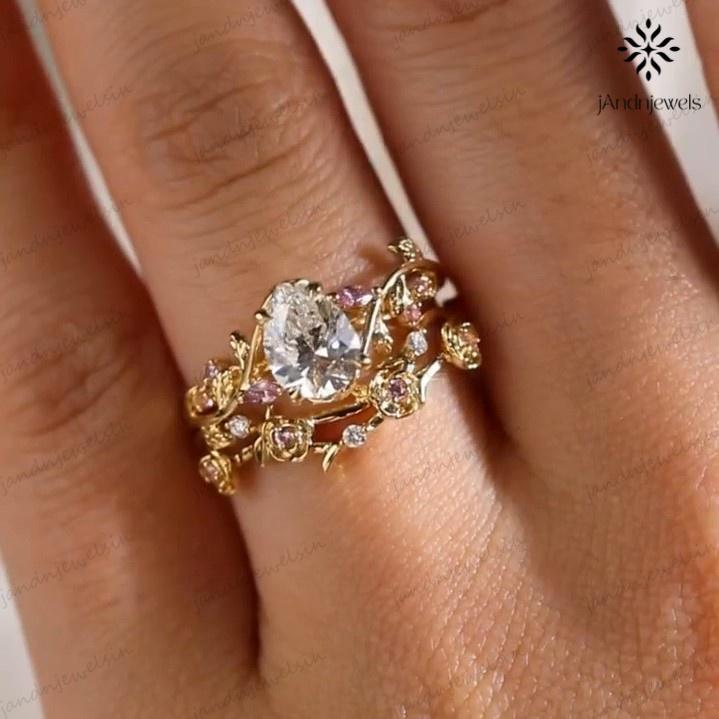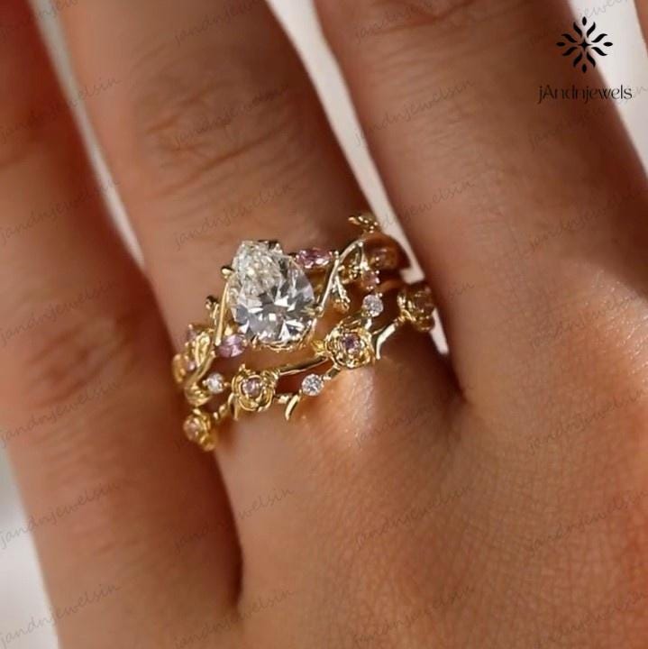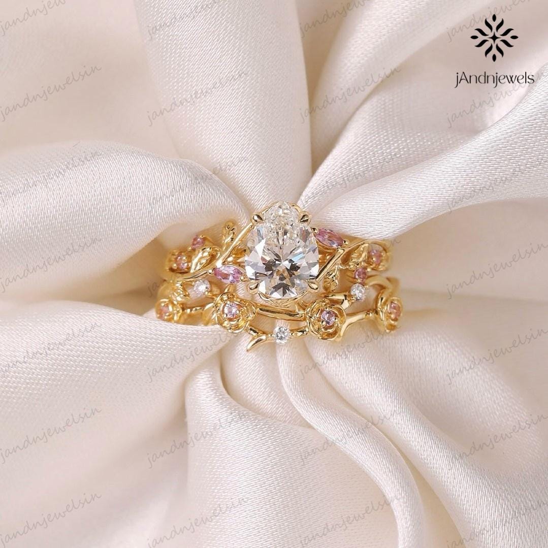 2CT Pear Cut Moissanite Ring Set Floral Leaf Engagement Ring 14K Gold Nature Inspired Wedding Ring for Women Unique Vintage Bridal Ring