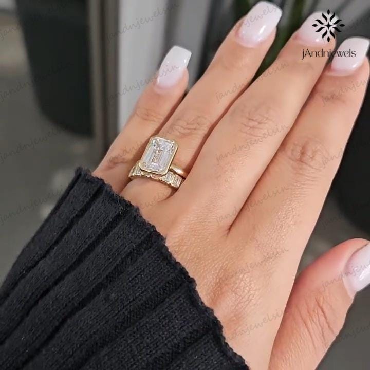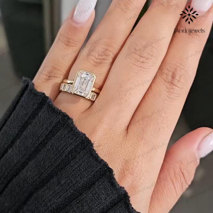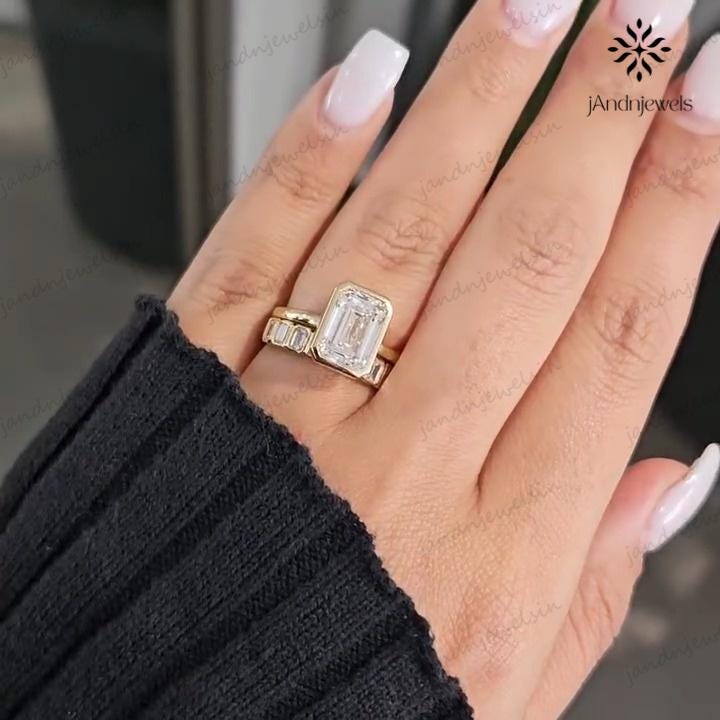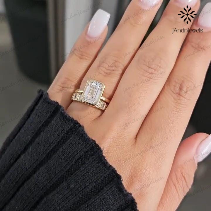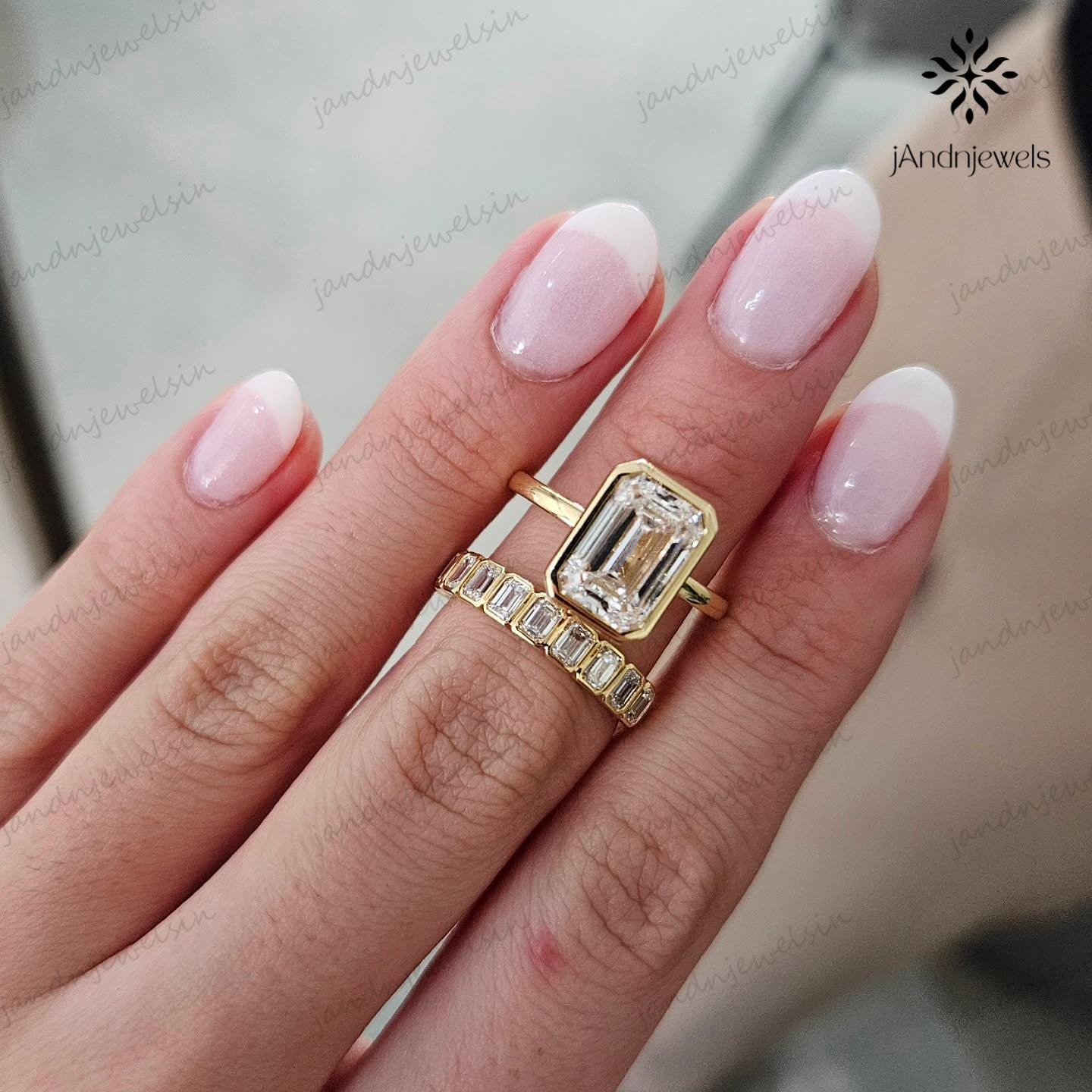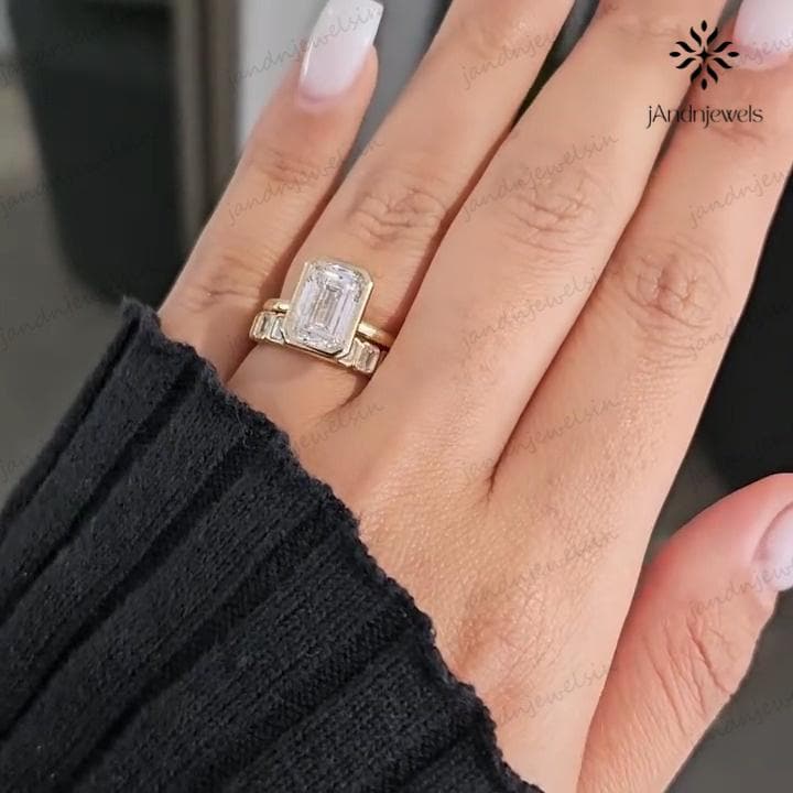 3.50 CT Emerald Cut Moissanite Engagement Ring Set, 14K/18K Solid Gold with Half Eternity Emerald Bezel Band, Wedding Matching Bridal Set